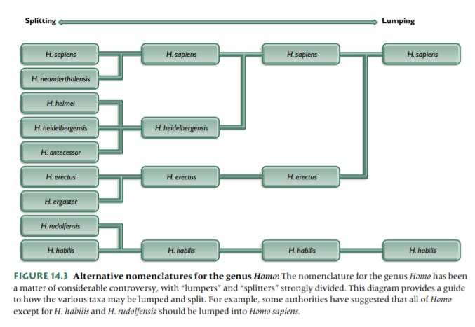 A note on taxonomy: I am going to try to identify differing names/opinions on names, but I’m inevitably going to make choices and there will be much more competent authorities that disagree with me for better reasons than I offer. At least half of those reasons have to do with teeth, which preserve better and make up more of the fossil record than practically any other bone. I will tell you that my bias is towards lumping, but that I am not perfectly consistent (sorry). In any event, here is a chart that shows the extremes between lumping and splitting those two, taken from Principles of Human Evolution: